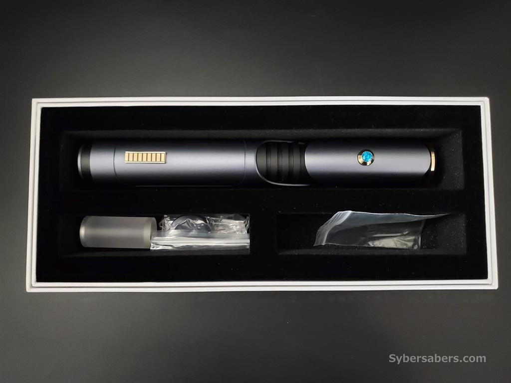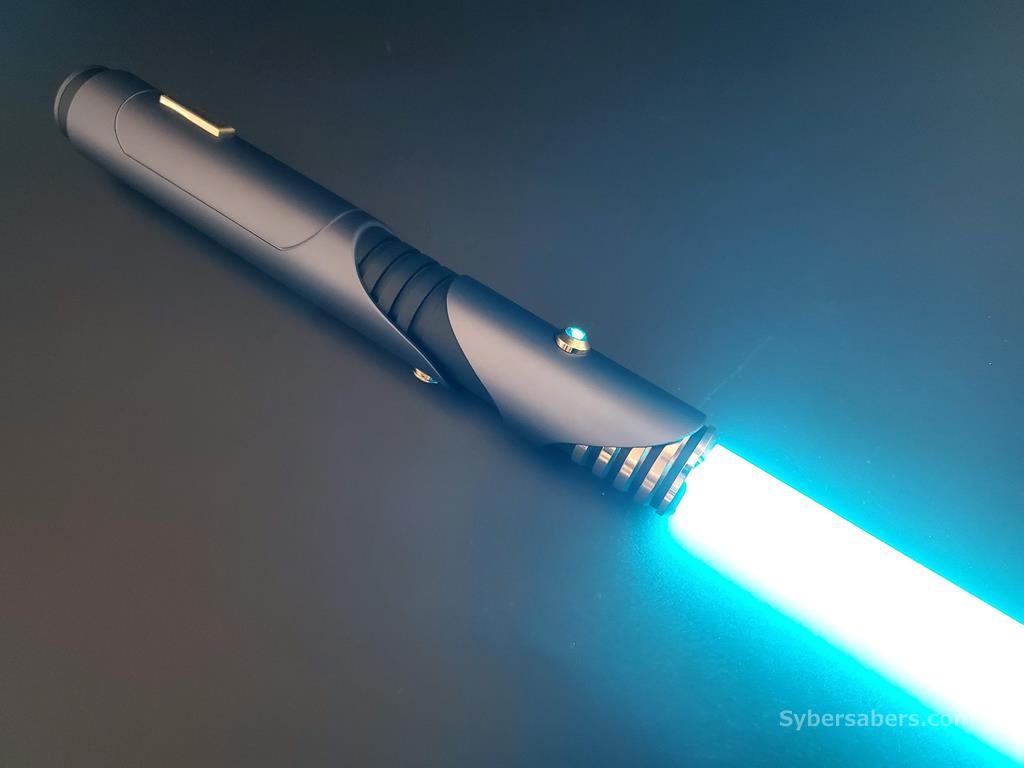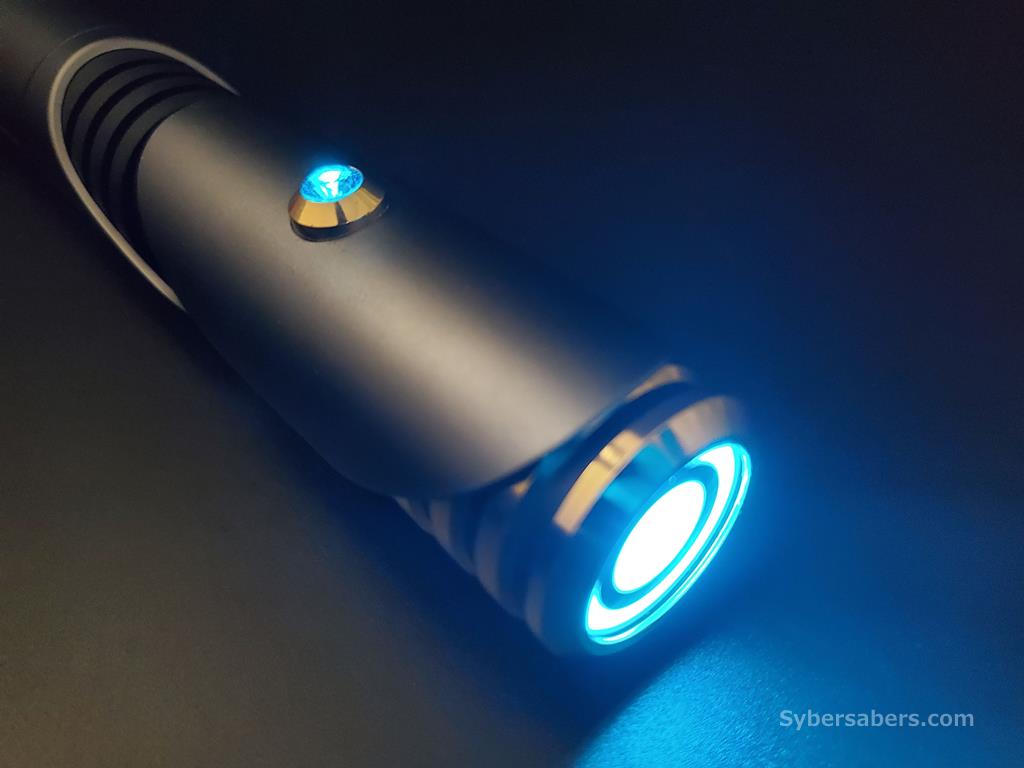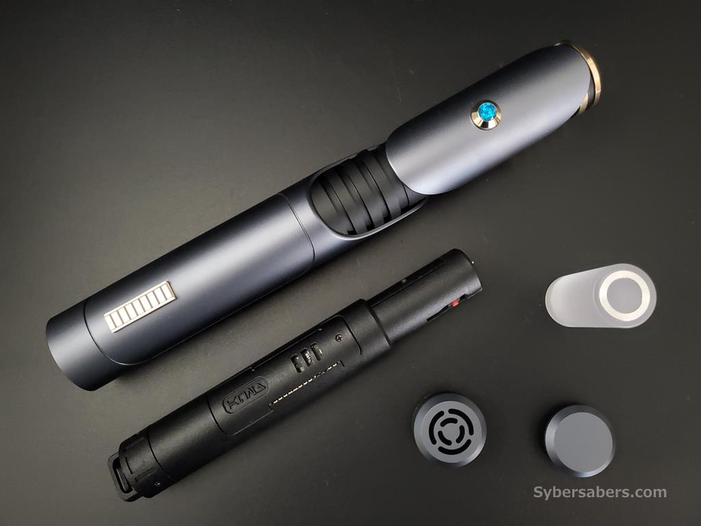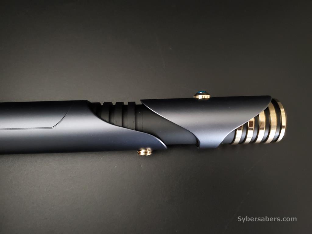 1ボタン式 ですが、Proffieboardを搭載しておりますので、操作性も高く十分な機能を備えております。エミッター付近にあるクリスタルパーツはブレードの光りを透過します。