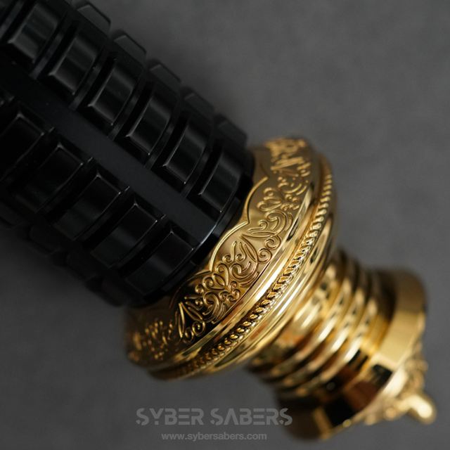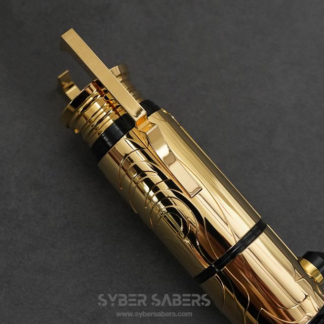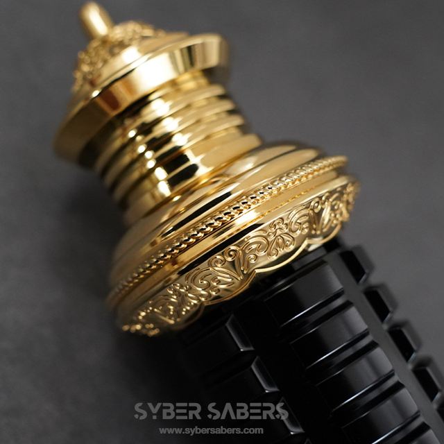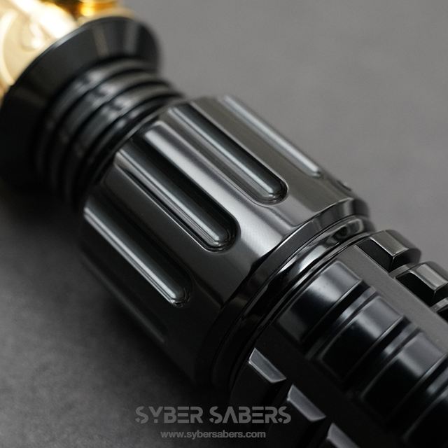 CNC削り出しによる6061アルミニウム製ヒルトに、真鍮パーツを随所に採用。