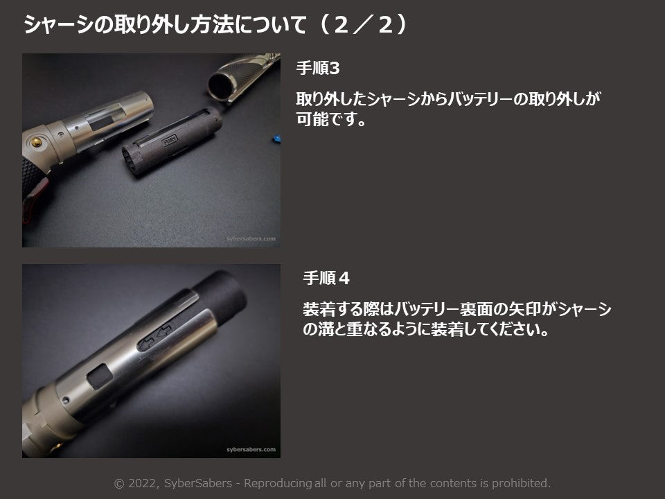 The battery can be easily attached and detached by simply removing the flathead screw on the underside of the hilt.