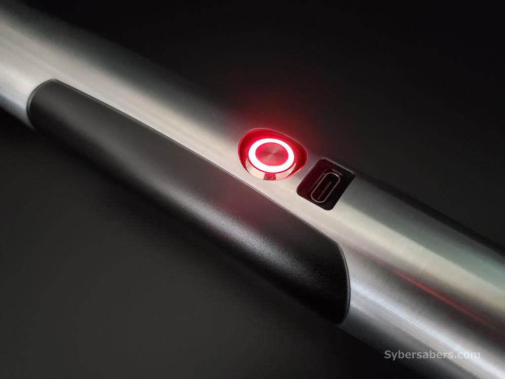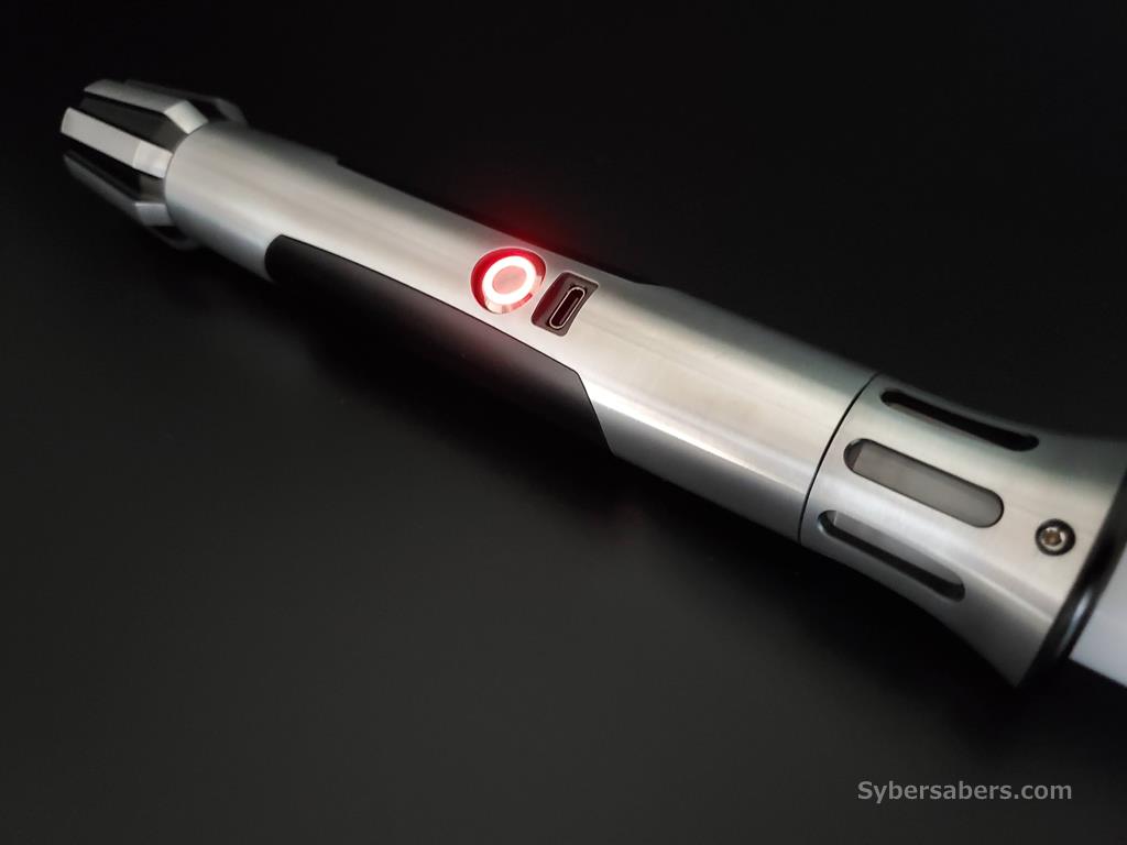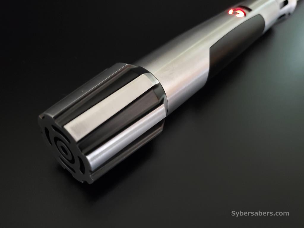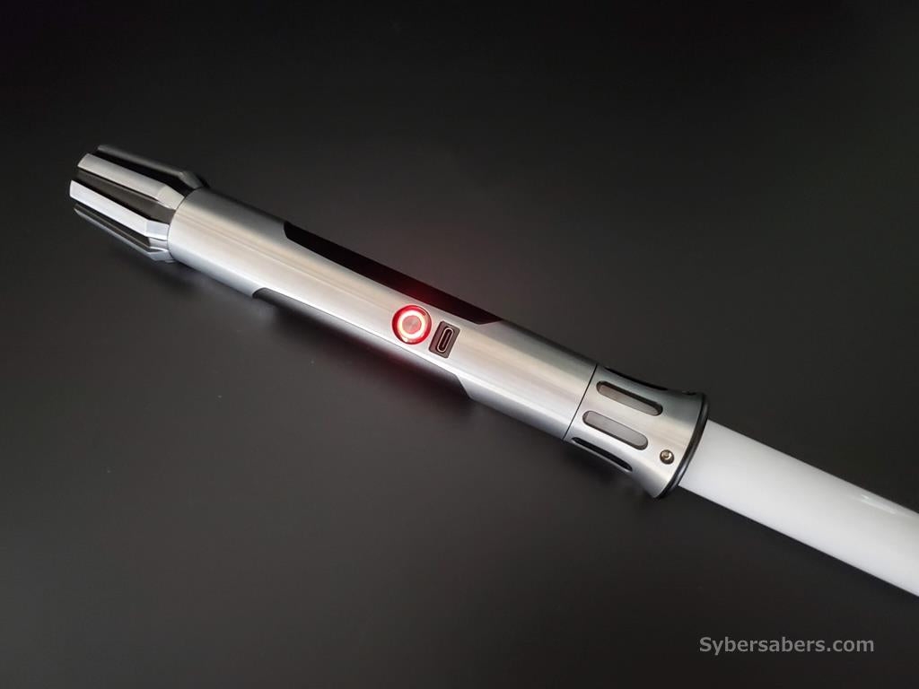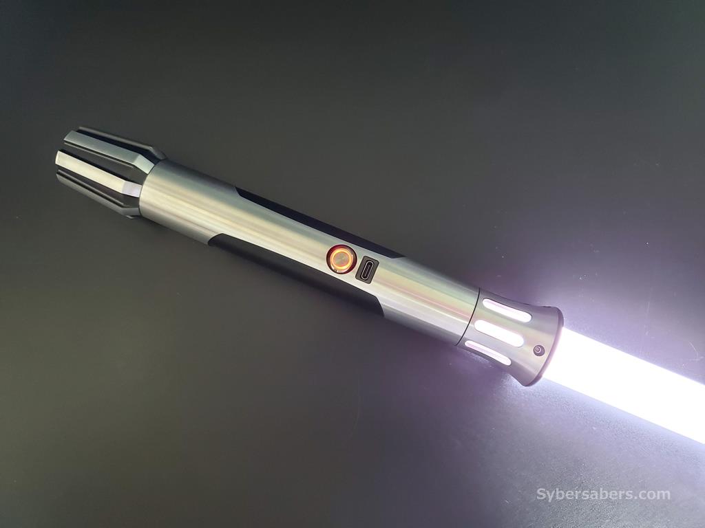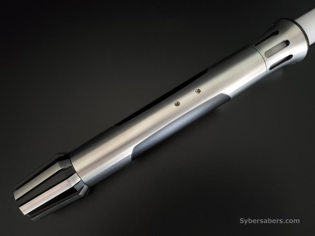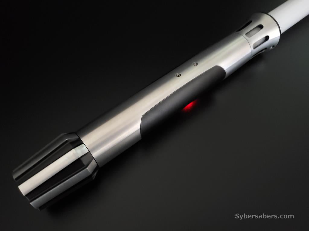 A lightsaber with a futuristic design, the slit on the emitter side allows light to pass through when the blade emits light.
