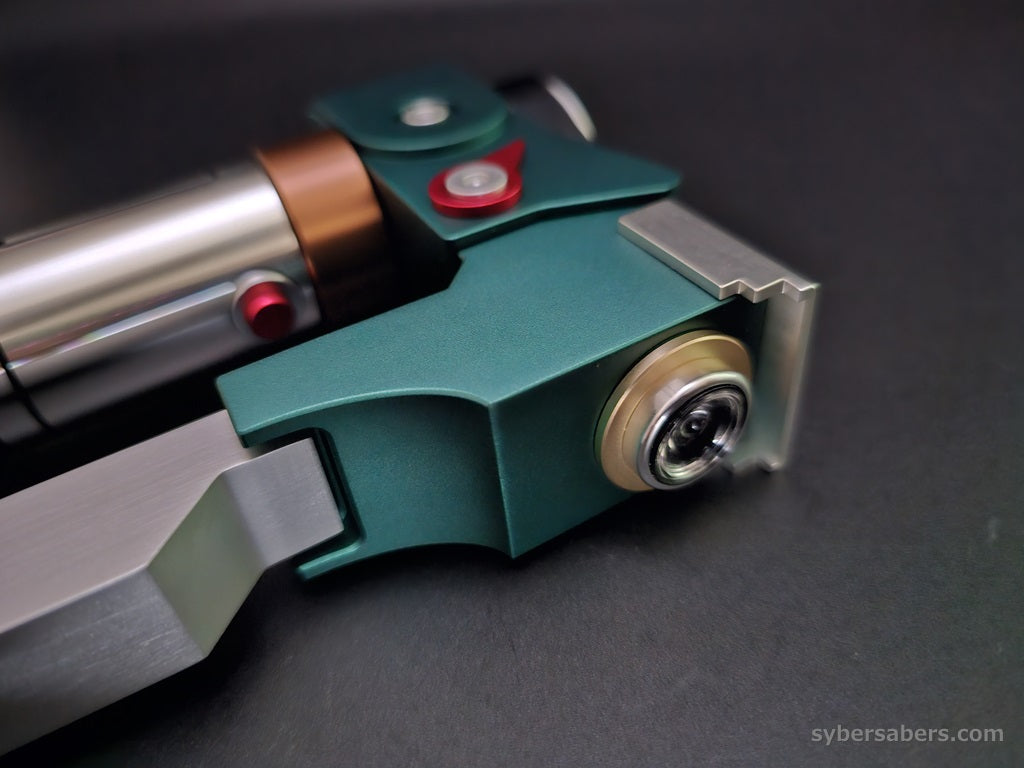There is a blaster lens part just like in the movie. Please note that the lens part does not emit light.