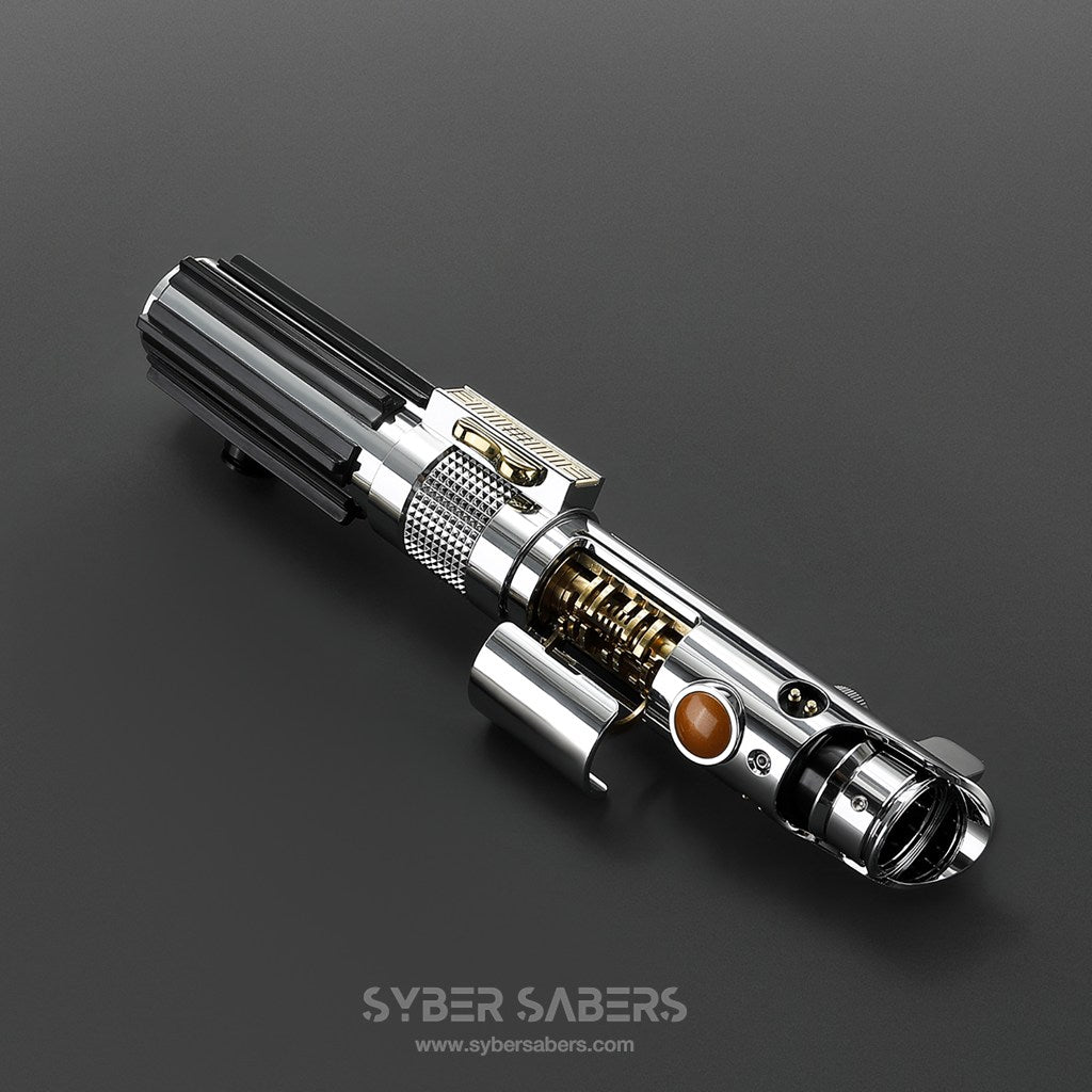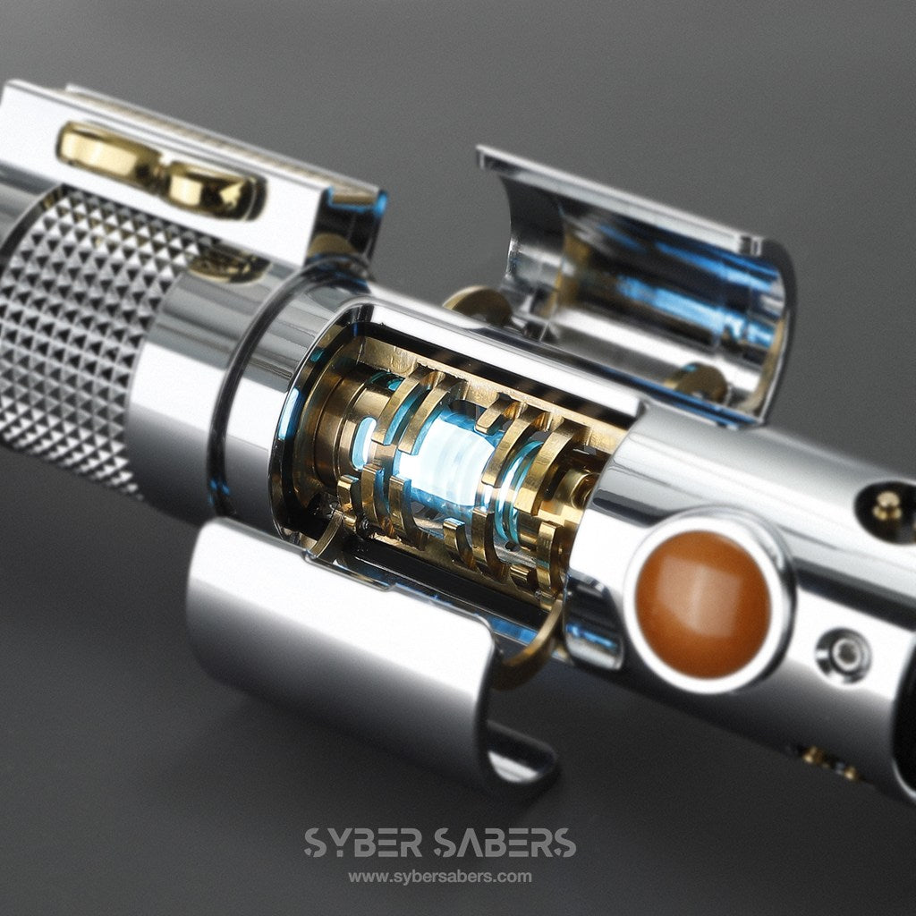 ヒルト中央部がメカニカルに展開し、内部に隠された「クリスタル・チャンバー」が露出。黄金色の真鍮パーツで構成された精密な機関部の中で、心臓部であるカイバー・クリスタルが輝きを放ちます。